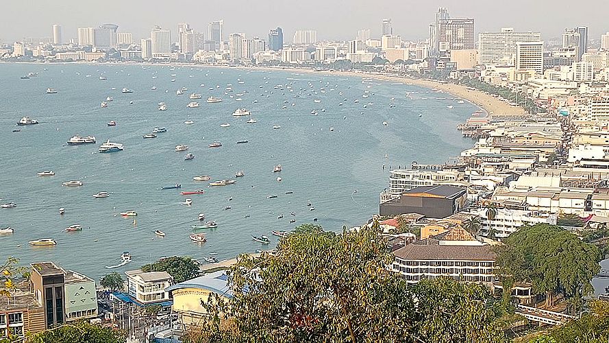 Blick auf die Bucht von Pattaya Pattaya ist ja bekannt für sein Rotlicht. Rechts, wo die Gebäude bis ans Wasser gehen, ist die Walking Street, das eigentliche Rotlichtviertel. Die ganze Bucht entlang geht die Beach Road, unsere bevorzugte Flaniermeile. Hinter der Bucht, also nördlich, geht es weiter mit Pattaya Nord, Naklua, dort wohnen die meisten deutschen Expats. Südlich, das wäre auf dem Bild unterhalb, ist Jomtien, auch mit vielen Expats, nicht nur deutschen. Wir gehen nie in der Pattaya Bucht baden. Man sieht die vielen Boote, und das Wasser ist nicht so sauber. Wir haben mehrere schöne Badestrände im Norden. oder wunderbar auf der Insel Koh Larn. Das ist links von dem Bild und man muss dorthin mit Booten übersetzen